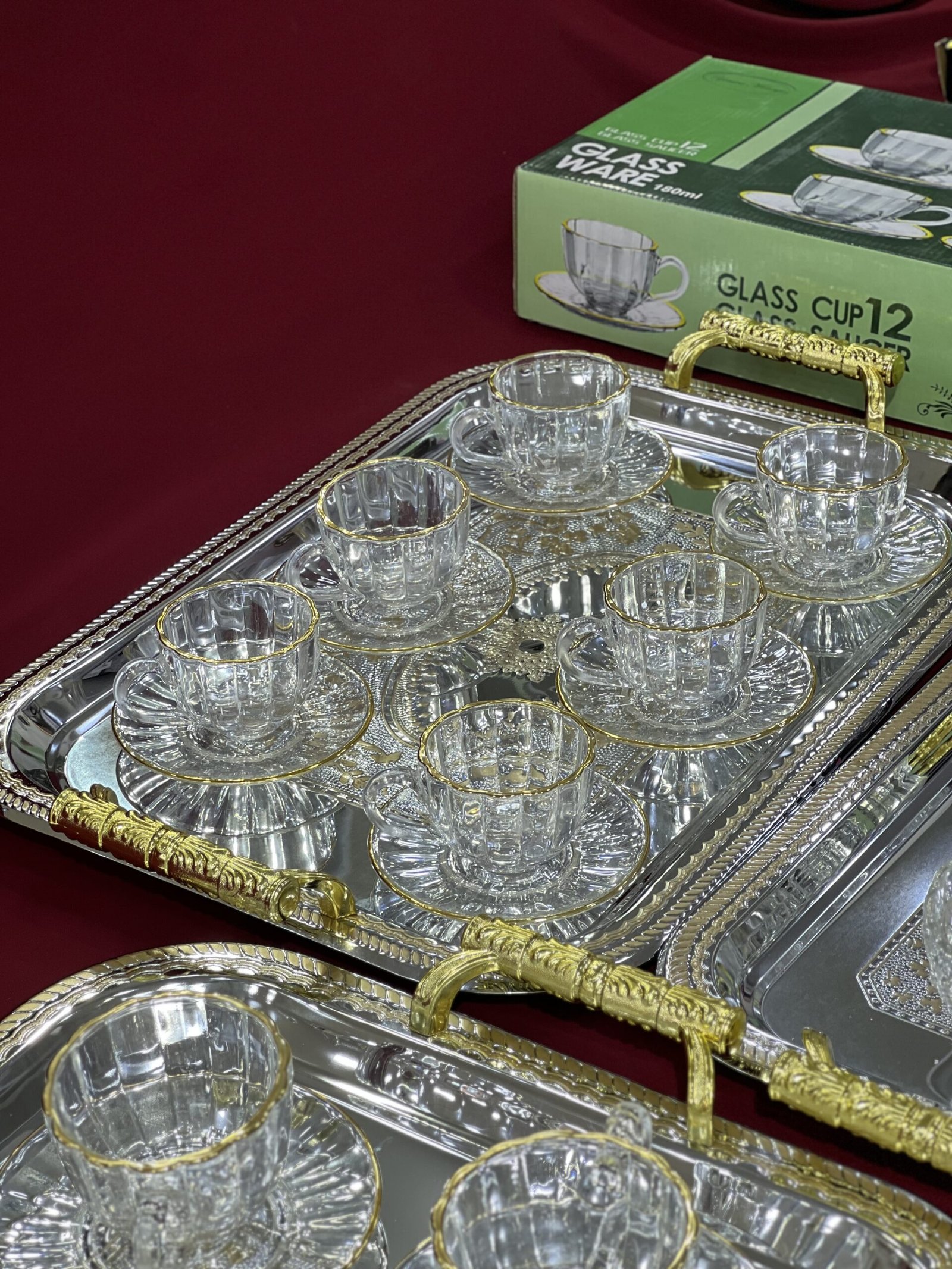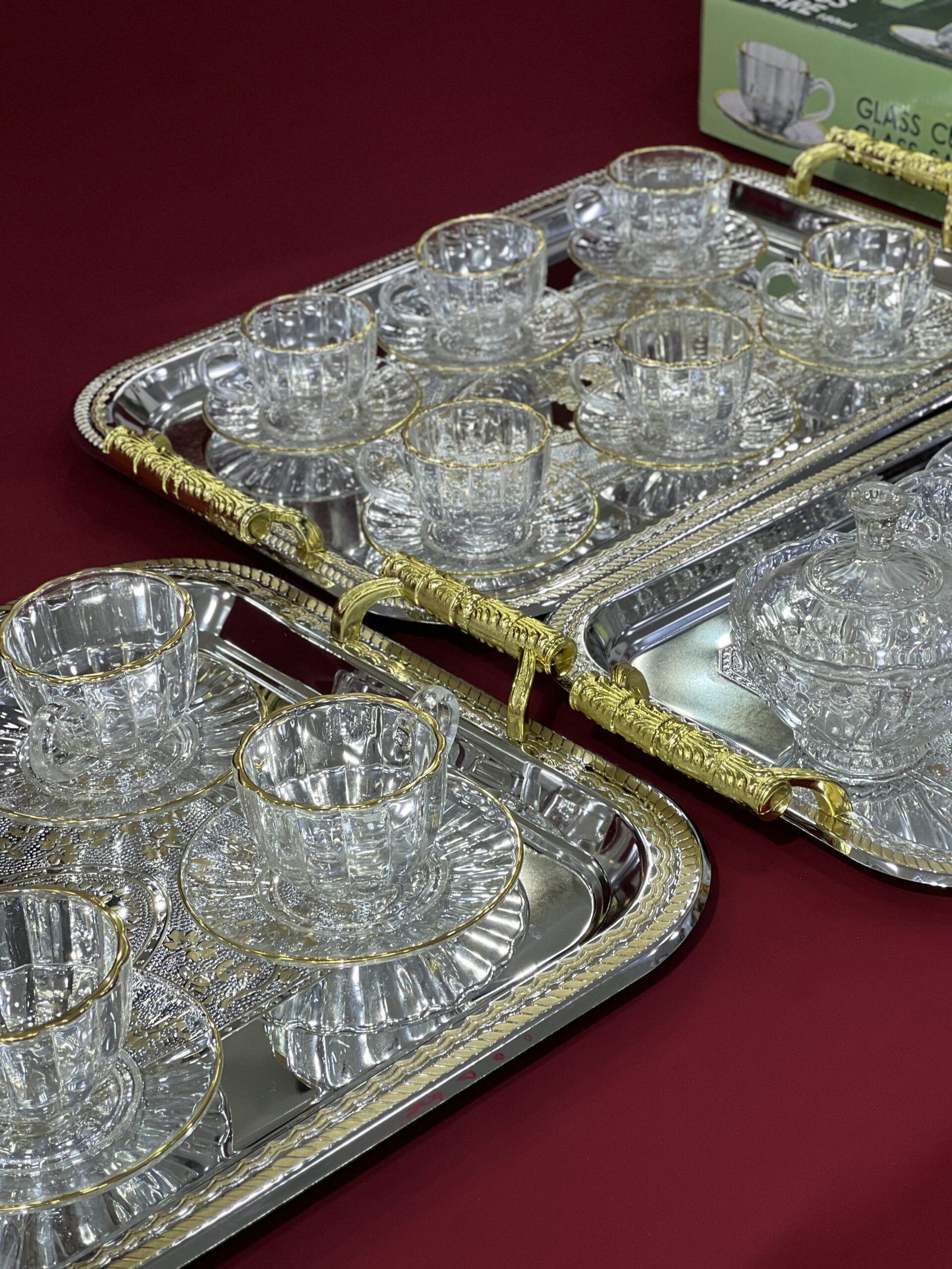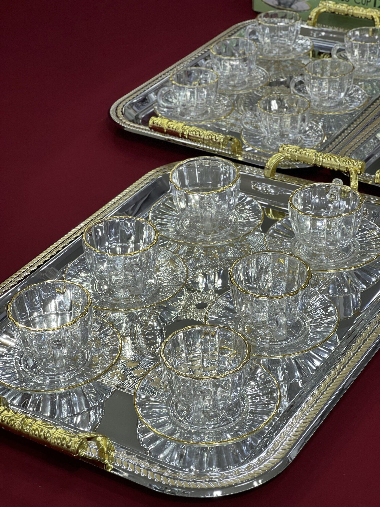 • 6 فناجين قهوة مع 6 صحون (12 قطعة)• 6 أكواب/بول للحليب مع 6 صحون لها (12 قطعة)• صينية تقديم من 3 قطع (plateau trois pièces) — 3 قطع