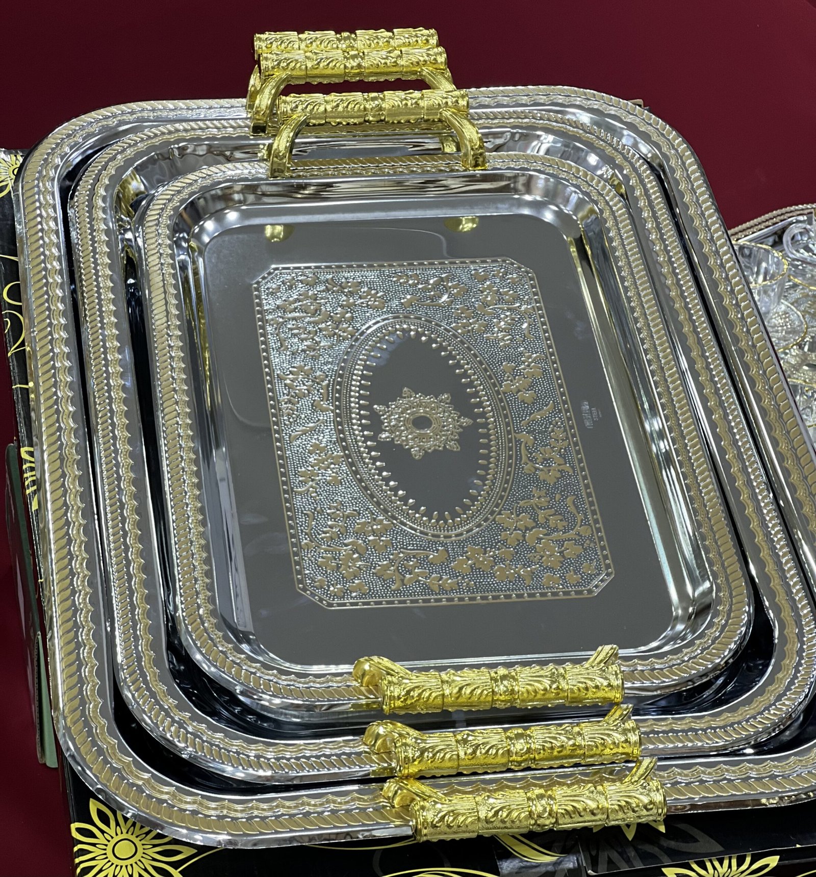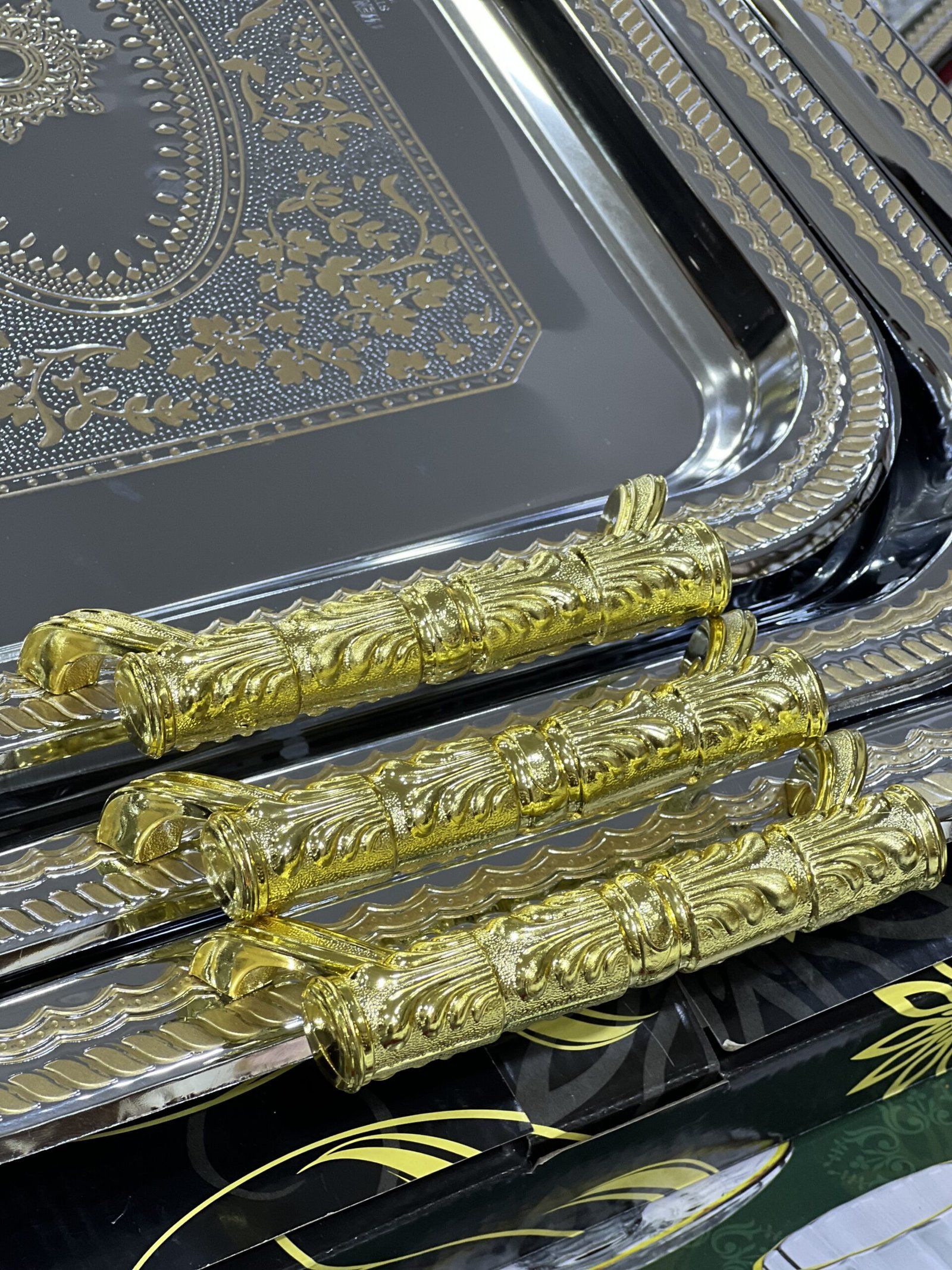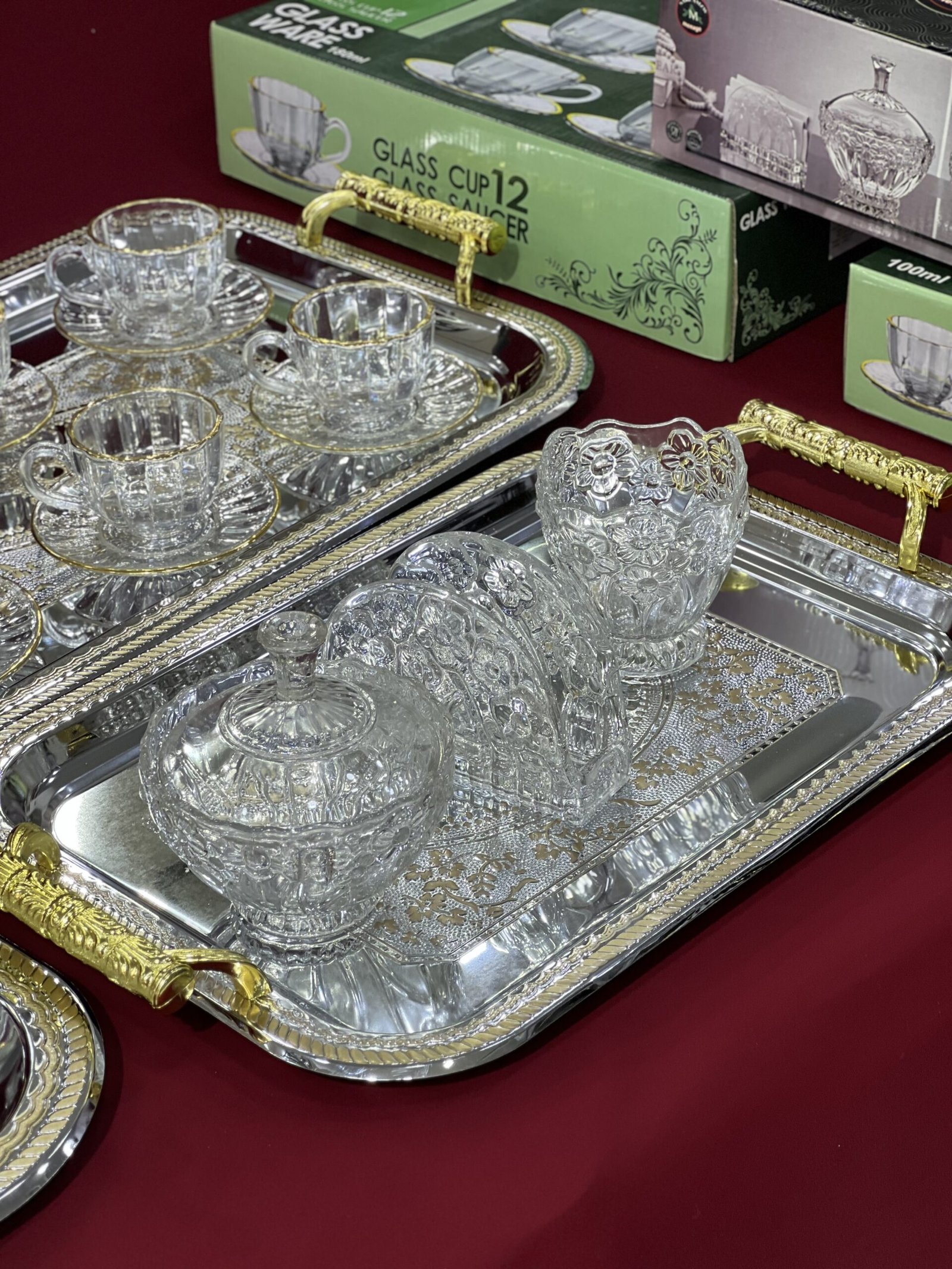 • 6 فناجين قهوة مع 6 صحون (12 قطعة)• 6 أكواب/بول للحليب مع 6 صحون لها (12 قطعة)• صينية تقديم من 3 قطع (plateau trois pièces) — 3 قطع